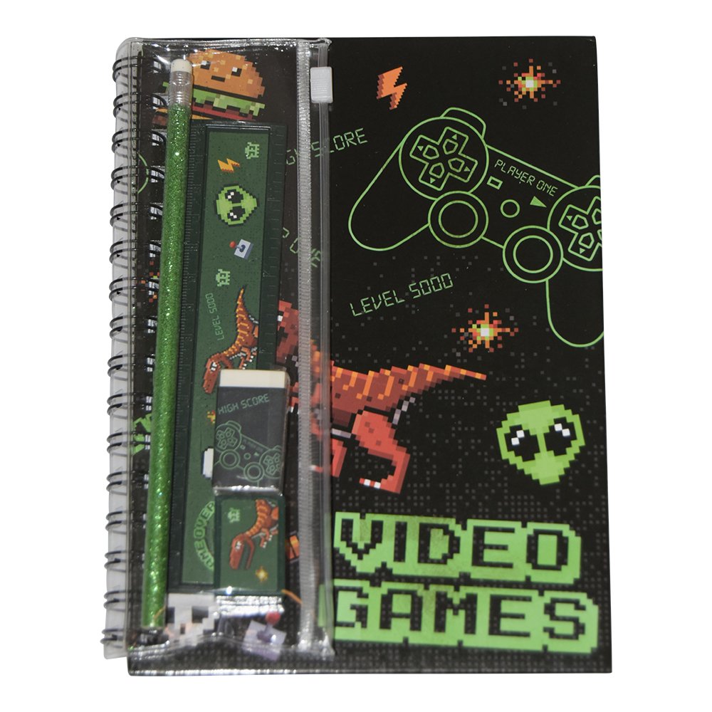 Det perfekte settet for å ønske deg velkommen tilbake til skolen som inneholder en 80-siders notatbok, viskelær, blyant, linjal og blyantspisser.