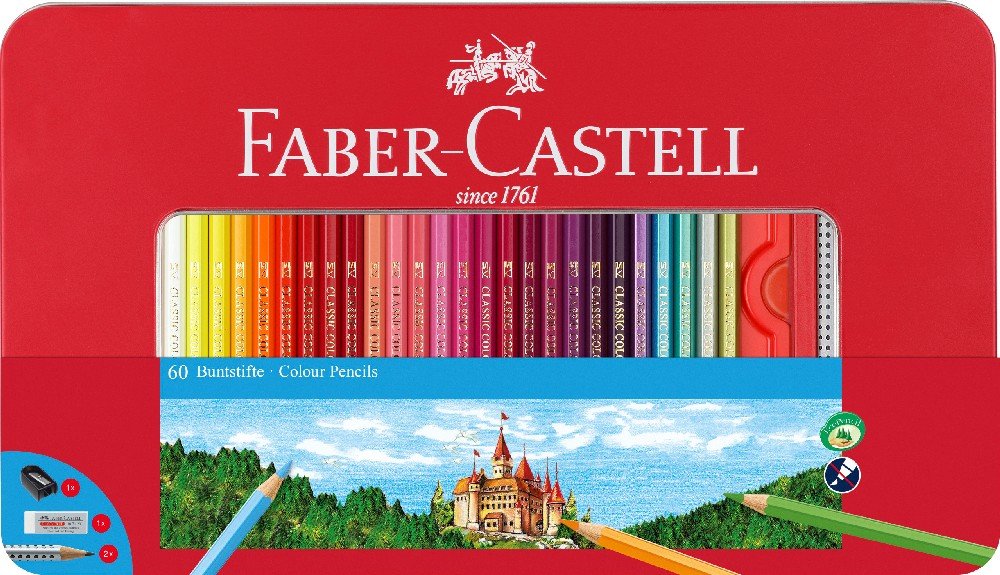 I tillegg til 60 blyanter inneholder dette settet også 2 grafittblyanter, en blyantspisser og et viskelær.
