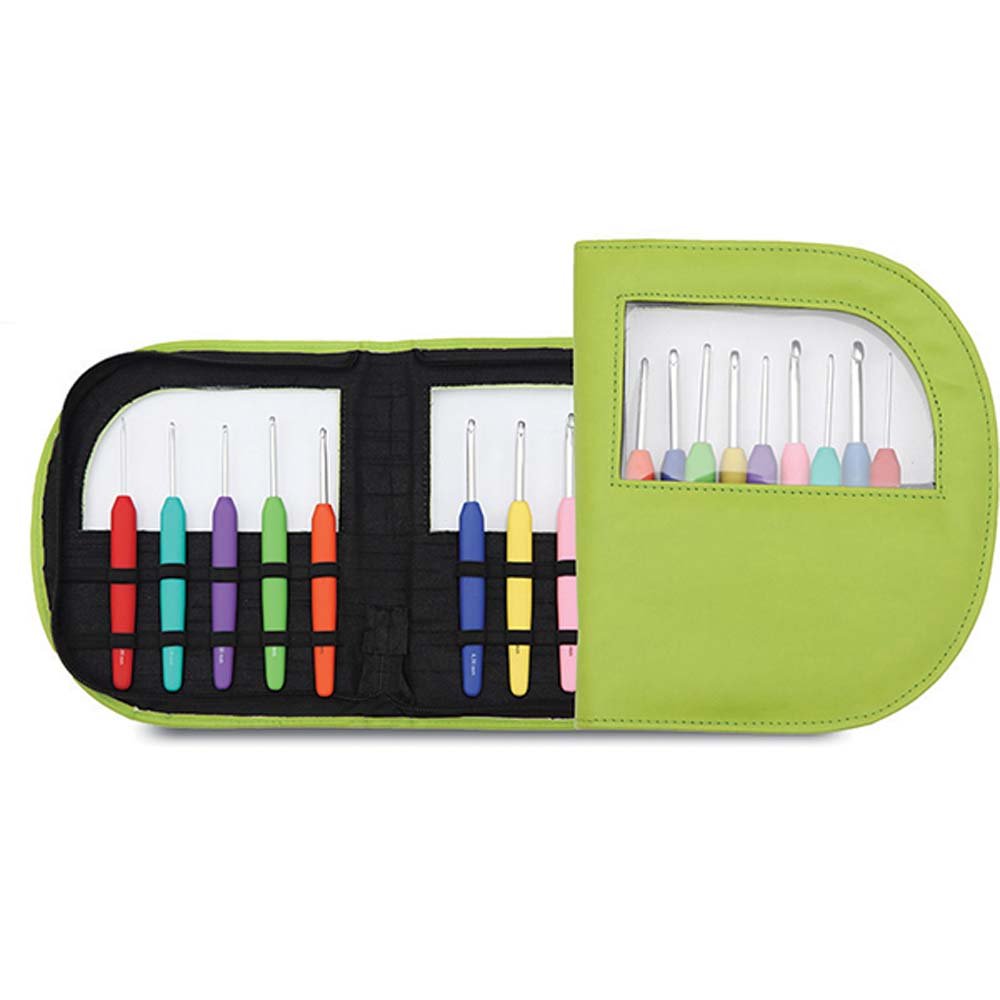 Et komplett sett med heklenåler i et vakkert grønt etui.