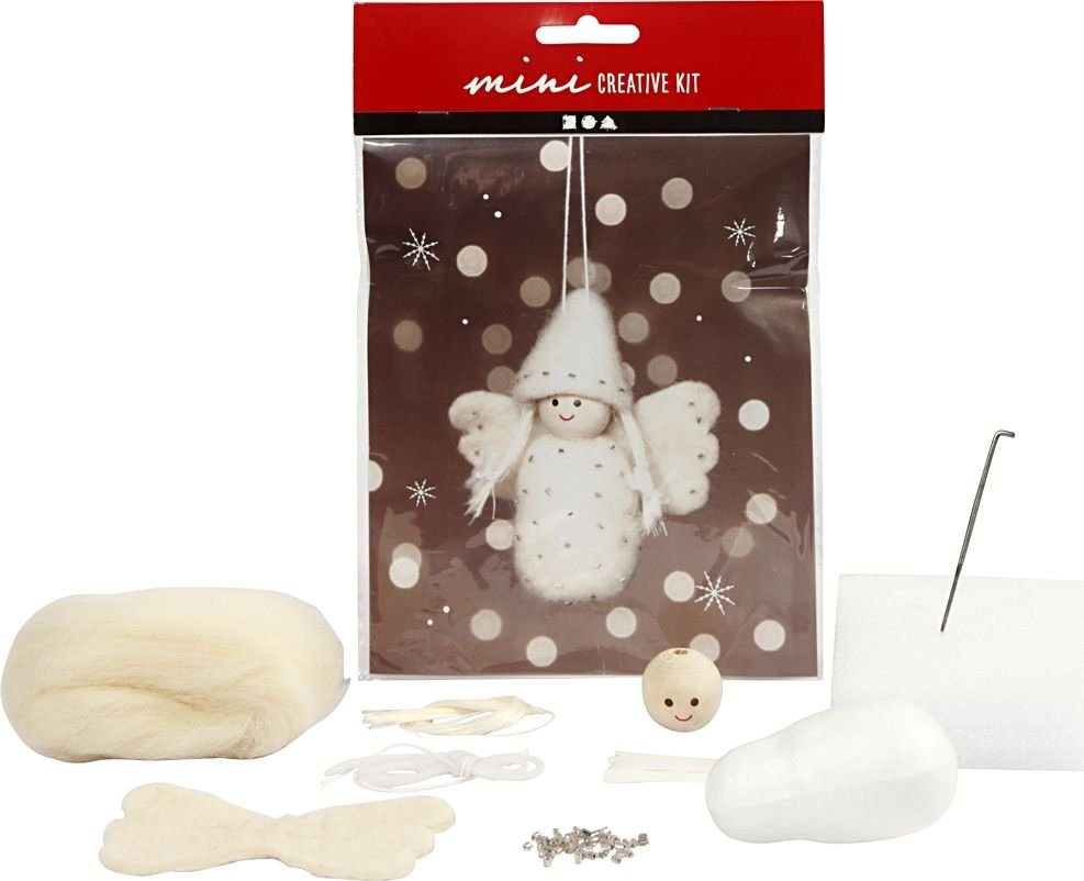 Materialsett for 1 nål tovet engel med filtvinger dekorert med rocai-perler.