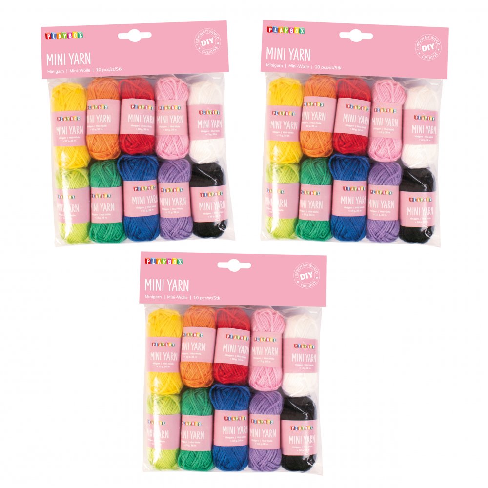 Miniballen i ti forskjellige farger. Akrylgarnet er av høy kvalitet og har mange praktiske egenskaper, kan med fordel brukes til strikking, hekling, broderi og håndverk. Akrylgarnet er fritt for AZO-fargestoffer og formaldehyd.