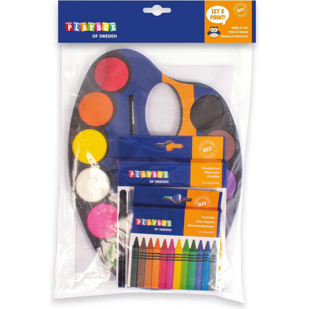 Praktisk nybegynnersett for de som vil komme i gang med maling og skaper. Inneholder en fargepalett, voksstifter og fiberblyanter og papir