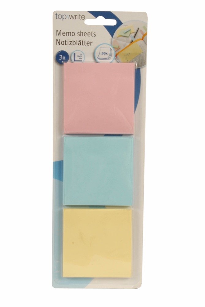 Inneholder 3 blokker med 50 ark hver. Arkene har lim på baksiden. De måler 75x75 mm.
